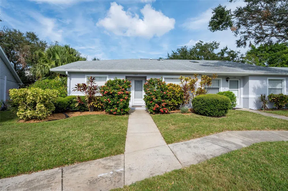 One or more photo(s) has been virtually staged. Beautiful Dunedin Villa with VAULTED CEILINGS and SKYLIGHTS throughout. This 2 bedroom, 2 bath villa with it's EXPANSIVE FLORIDA ROOM will check all your boxes! LIGHT AND BRIGHT, SPACIOUS and PRIVATE, this is the one you've been looking for! The CHARMING KITCHEN has loads of cabinets and is open to the dining room and living room with sliders to the fully enclosed Florida room. With this layout, the unit feel absolutely HUGE, especially with the SOARING VAULTED CEILINGS! The convenience of plenty of storage is in abundance in this unit, with extra storage closets in the Florida Room. Inside laundry closet houses the washer & dryer with plenty of room for all your supplies. The primary bedroom enjoys a walk-in closet and en suite bath with skylight and soaring vaulted ceilings, including a large double vanity. The back yard is truly a private oasis, beautifully landscaped with mature flowering trees and tropical plants. Amenities are plentiful at this community with a gorgeous pool area, tennis courts and pickle ball courts in addition to a lovely club house, grounds maintenance, internet and cable tv. Call for your showing today!